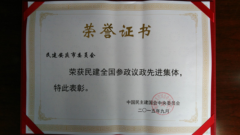 9月16至17日民建中央参政议政工作会议在北京举行,在此次会议上,民建中央对参政议政工作成绩卓著的100个民建组织和200名会员进行表彰。民建安庆市委被民建中央评为“民建全国参政议政先进集体”。